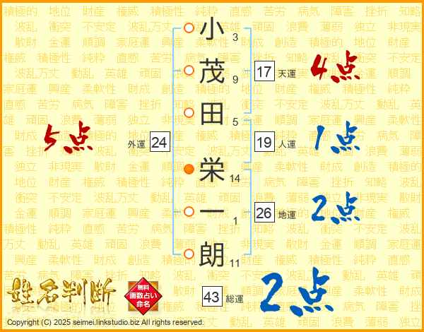 小茂田栄一朗さんの総運は43画の2点!