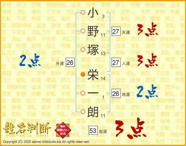 小(3画)野(11画)塚(13画) 栄(14画)一(1画)朗(11画)