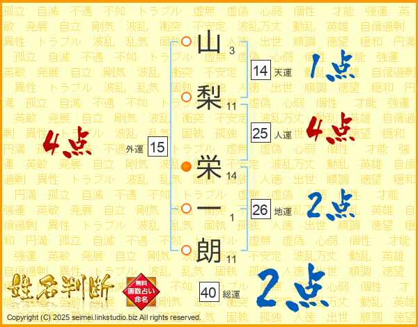 山(3画)梨(11画) 栄(14画)一(1画)朗(11画)