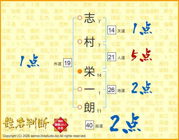 志(7画)村(7画) 栄(14画)一(1画)朗(11画)