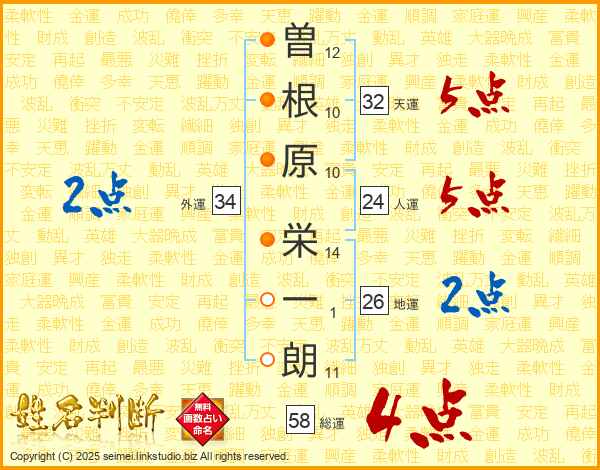 曽(12画)根(10画)原(10画) 栄(14画)一(1画)朗(11画)
