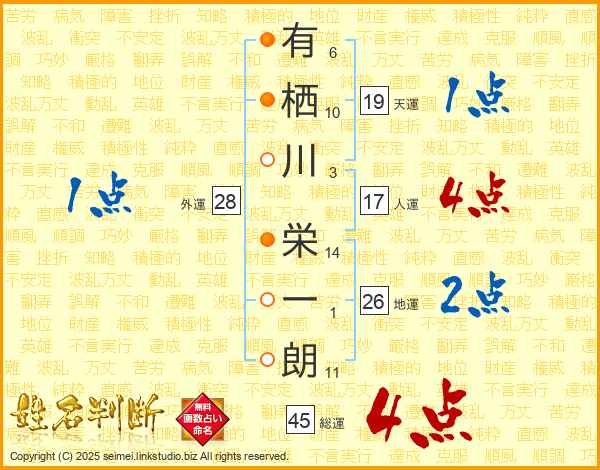 有(6画)栖(10画)川(3画) 栄(14画)一(1画)朗(11画)