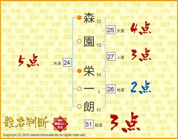 森(12画)園(13画) 栄(14画)一(1画)朗(11画)