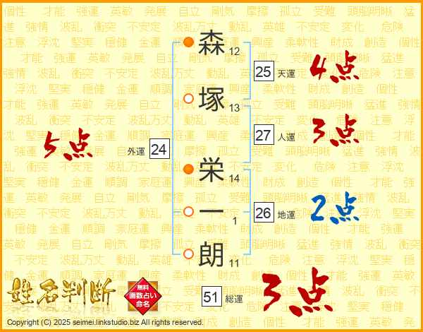 森(12画)塚(13画) 栄(14画)一(1画)朗(11画)