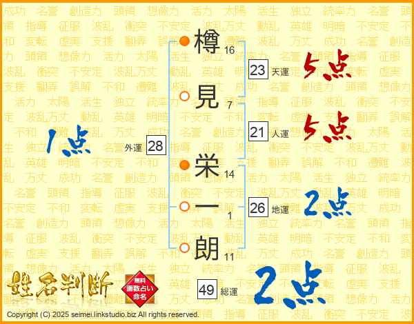 樽(16画)見(7画) 栄(14画)一(1画)朗(11画)