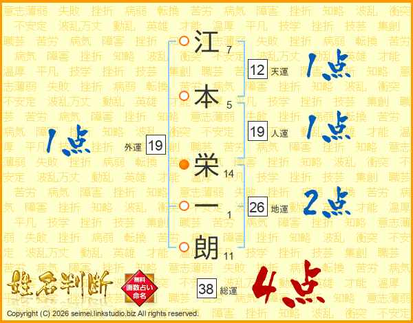 江(7画)本(5画) 栄(14画)一(1画)朗(11画)
