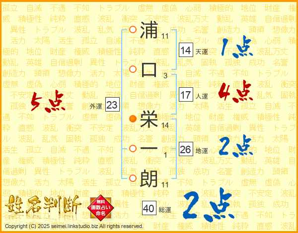 浦(11画)口(3画) 栄(14画)一(1画)朗(11画)