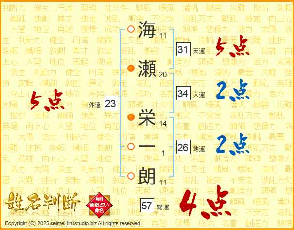 海(11画)瀬(20画) 栄(14画)一(1画)朗(11画)