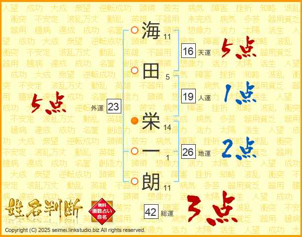 海(11画)田(5画) 栄(14画)一(1画)朗(11画)