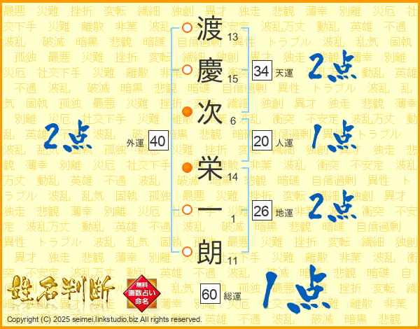 渡(13画)慶(15画)次(6画) 栄(14画)一(1画)朗(11画)