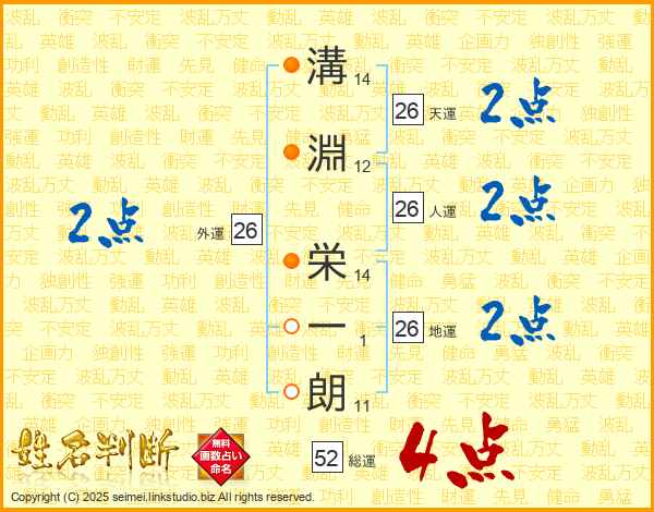 溝(14画)淵(12画) 栄(14画)一(1画)朗(11画)