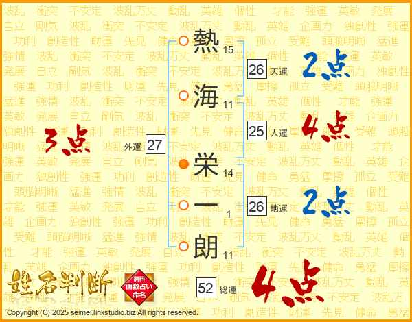 熱(15画)海(11画) 栄(14画)一(1画)朗(11画)