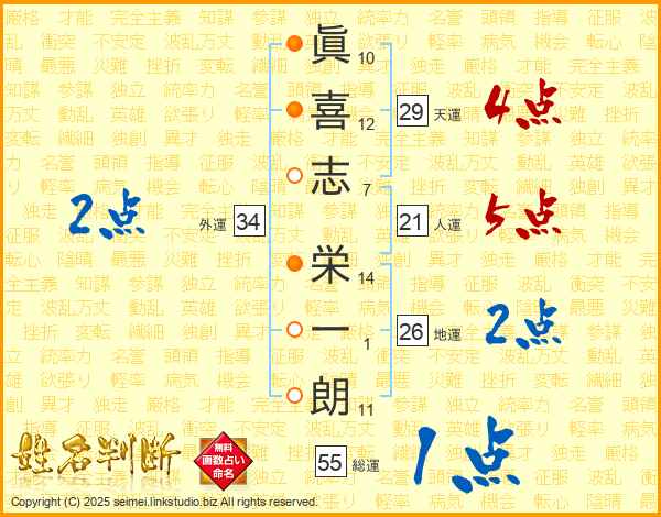 眞(10画)喜(12画)志(7画) 栄(14画)一(1画)朗(11画)