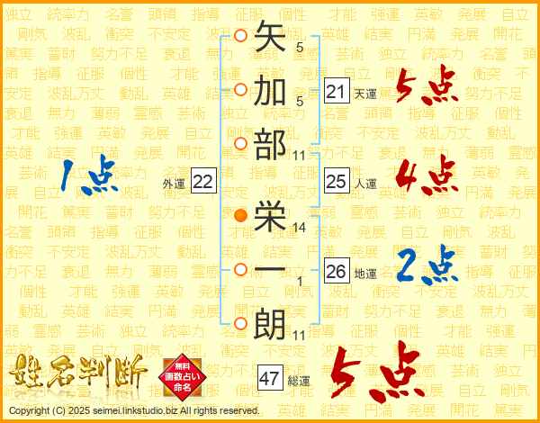 矢(5画)加(5画)部(11画) 栄(14画)一(1画)朗(11画)