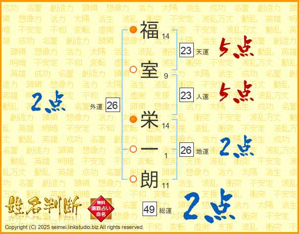 福(14画)室(9画) 栄(14画)一(1画)朗(11画)