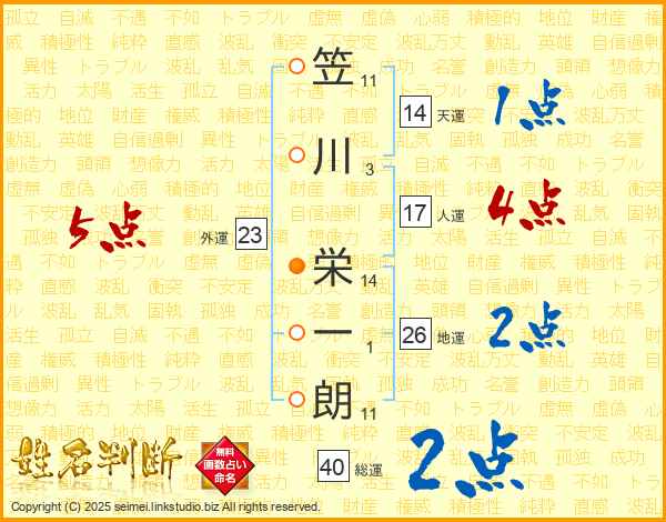 笠(11画)川(3画) 栄(14画)一(1画)朗(11画)