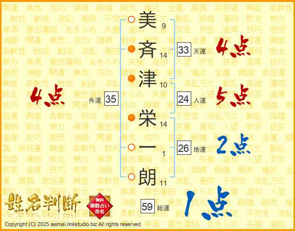 美(9画)斉(14画)津(10画) 栄(14画)一(1画)朗(11画)