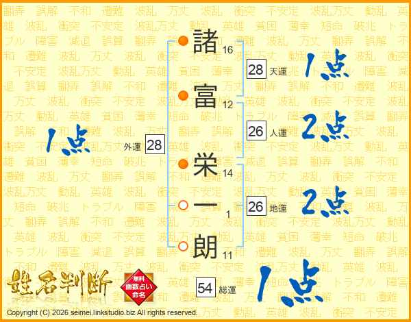 諸(16画)富(12画) 栄(14画)一(1画)朗(11画)