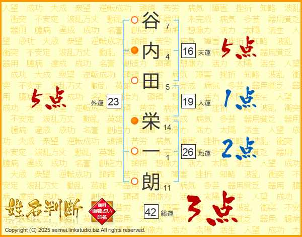 谷(7画)内(4画)田(5画) 栄(14画)一(1画)朗(11画)