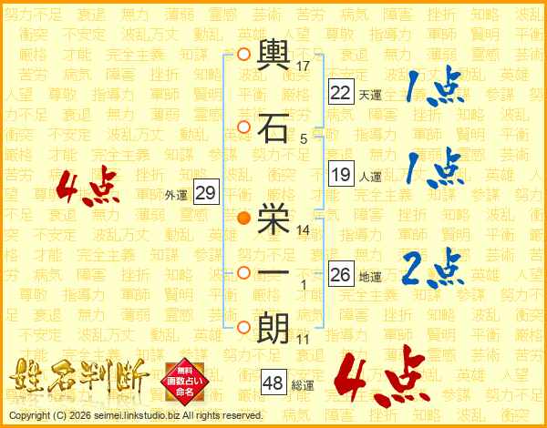 輿(17画)石(5画) 栄(14画)一(1画)朗(11画)