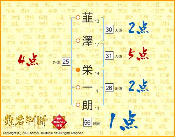 韮(13画)澤(17画) 栄(14画)一(1画)朗(11画)