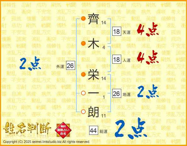 齊(14画)木(4画) 栄(14画)一(1画)朗(11画)