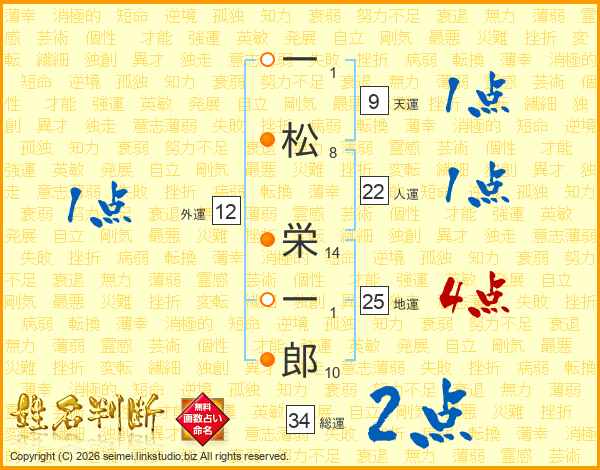 一(1画)松(8画) 栄(14画)一(1画)郎(10画)