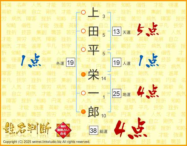 上(3画)田(5画)平(5画) 栄(14画)一(1画)郎(10画)