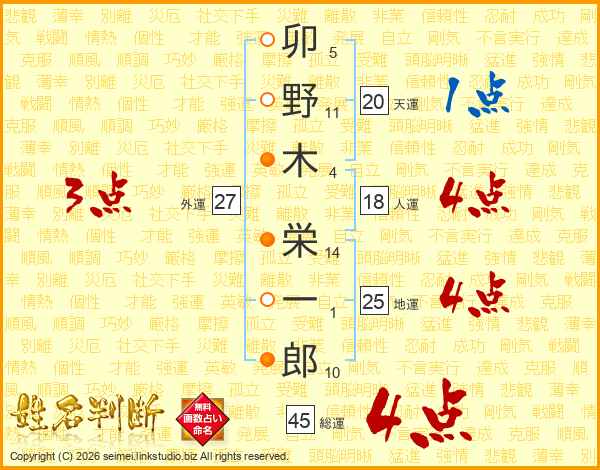 卯(5画)野(11画)木(4画) 栄(14画)一(1画)郎(10画)