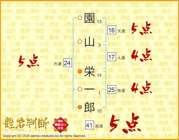 園(13画)山(3画) 栄(14画)一(1画)郎(10画)