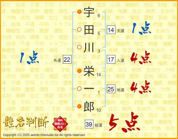宇(6画)田(5画)川(3画) 栄(14画)一(1画)郎(10画)
