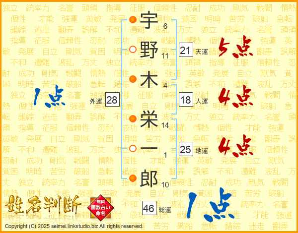 宇(6画)野(11画)木(4画) 栄(14画)一(1画)郎(10画)