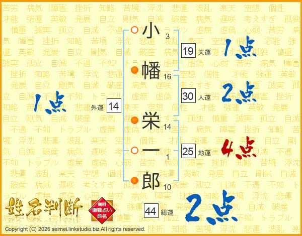小(3画)幡(16画) 栄(14画)一(1画)郎(10画)