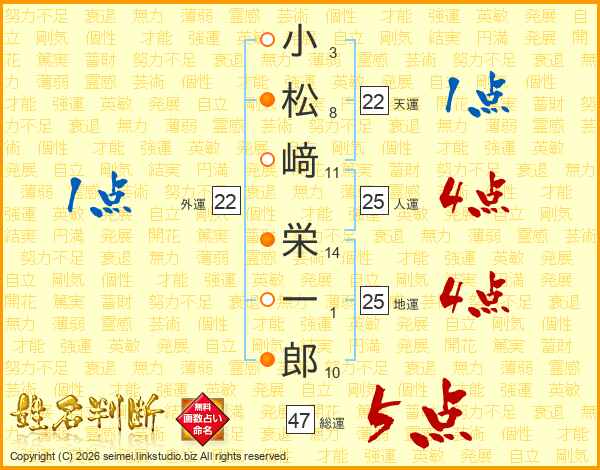 小(3画)松(8画)﨑(11画) 栄(14画)一(1画)郎(10画)