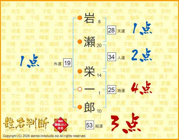 岩(8画)瀬(20画) 栄(14画)一(1画)郎(10画)