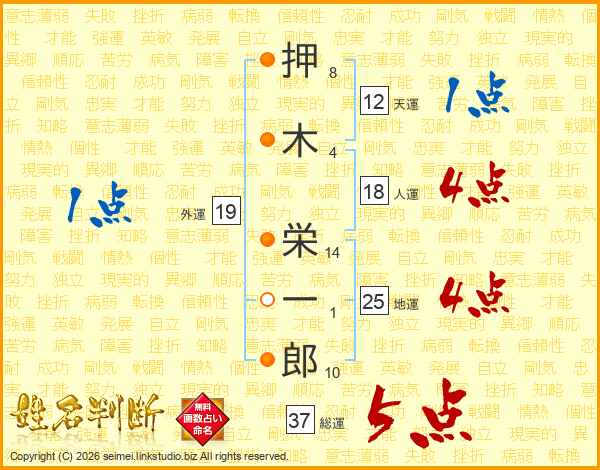 押(8画)木(4画) 栄(14画)一(1画)郎(10画)