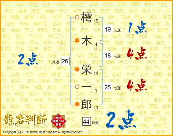 樗(15画)木(4画) 栄(14画)一(1画)郎(10画)