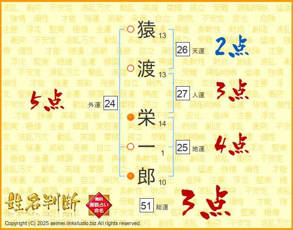 猿(13画)渡(13画) 栄(14画)一(1画)郎(10画)