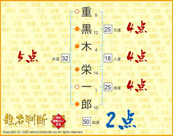 重(9画)黒(12画)木(4画) 栄(14画)一(1画)郎(10画)