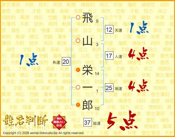 飛山栄一郎さんの総運は37画の5点!