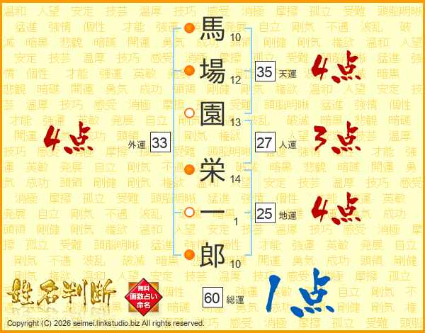 馬(10画)場(12画)園(13画) 栄(14画)一(1画)郎(10画)