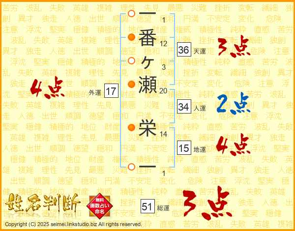 一番ヶ瀬栄一さんの総運は51画の3点!