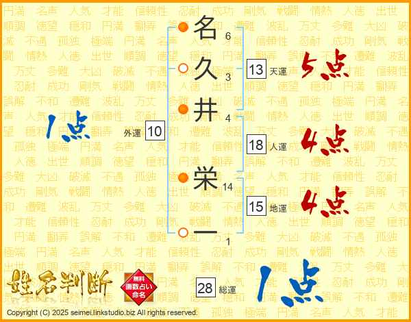 名(6画)久(3画)井(4画) 栄(14画)一(1画)