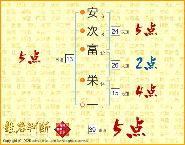 安(6画)次(6画)富(12画) 栄(14画)一(1画)
