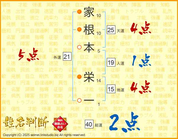 家(10画)根(10画)本(5画) 栄(14画)一(1画)