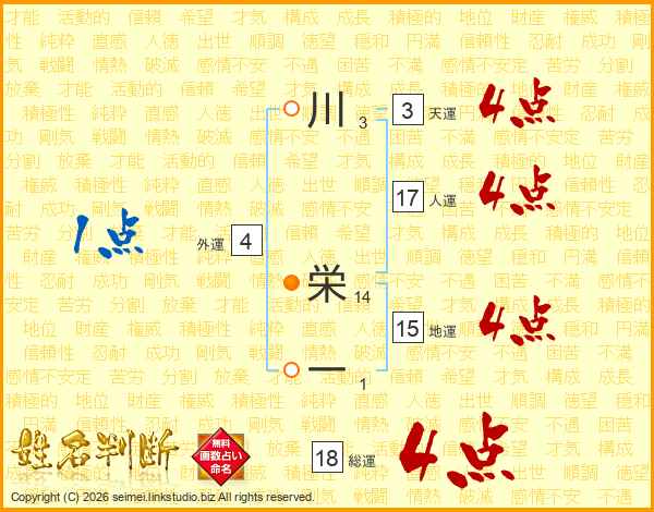 生活面を象徴する運勢です。外部から受ける影響力を表し、結婚運、家庭運や職場、環境への順応性を表します。総運から人運を引いた画数。姓や名が1文字の場合を除く。