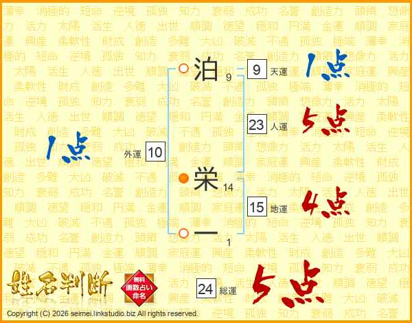 生活面を象徴する運勢です。外部から受ける影響力を表し、結婚運、家庭運や職場、環境への順応性を表します。総運から人運を引いた画数。姓や名が1文字の場合を除く。