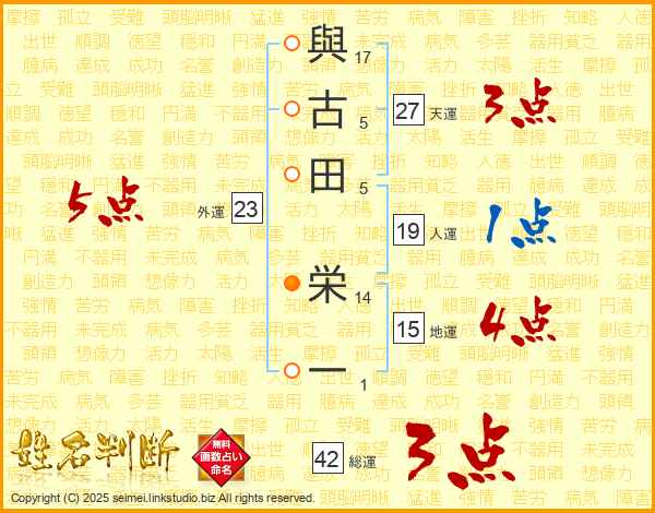 與(17画)古(5画)田(5画) 栄(14画)一(1画)