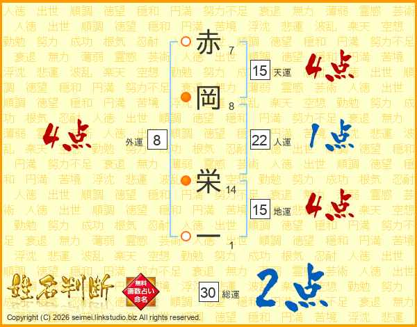 赤(7画)岡(8画) 栄(14画)一(1画)