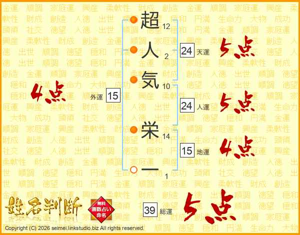 超人気栄一さんの総運は39画の5点!